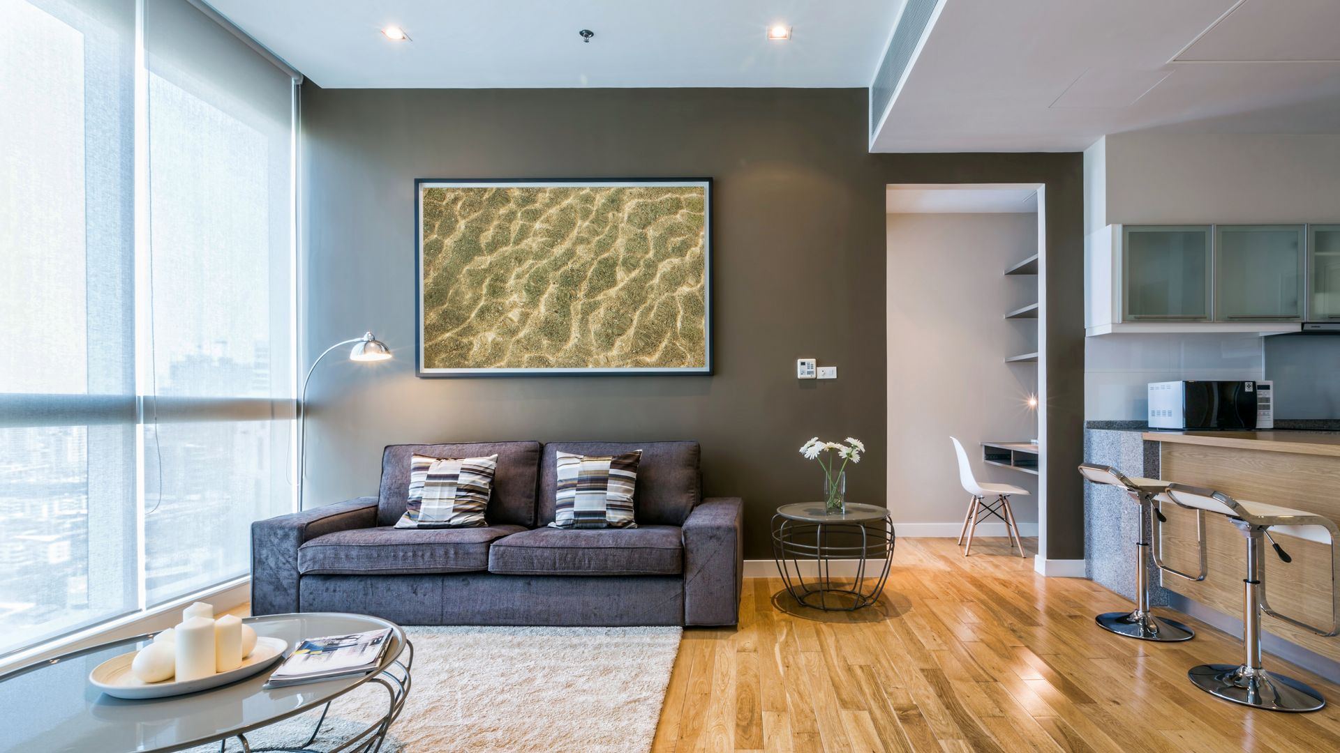 living room with big window and brown wall interior